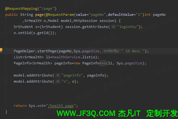 请求路径/web/healt/page,传入参数pageNo(默认第一页),根据session获取当前学生的登录信息,将该学生的id传入healthService.list()查询该学生上报的健康数据,使用pagehelper进行分页。并将查询结果封装到pageInfo实体,使用model传给jsp页面,代码如下: