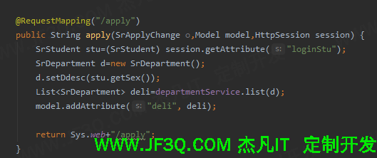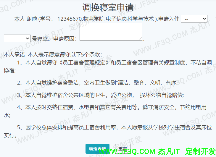 该功能主要使用使用form表单提交到/web/applyChange/apply,根据session获取当前学生的登录信息,将该学生的id传入学生实体,并在service里把该数据的审核状态设置未0(使用result字段标识审核状态:0标识待审核,1标识同意换寝室,-1标识不同意换寝室,-2标识学生撤回申请),调用applyChangeService.save()保存至数据库, 代码如下: