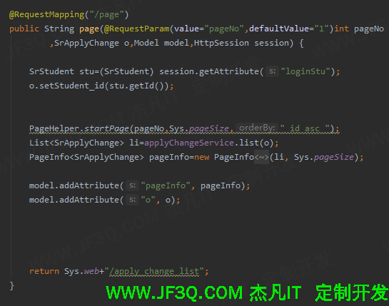 请求路径/web/applyChange/page,传入参数pageNo(默认第一页),根据session获取当前学生的登录信息,将该学生的id传入applyChangeService.list()查询该学生的换寝申请数据,使用pagehelper进行分页。并将查询结果封装到pageInfo实体,使用model传给jsp页面,代码如下: