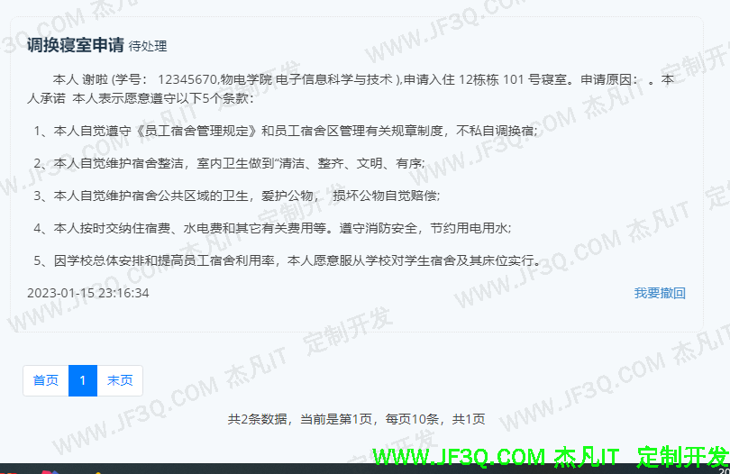该页面使用el表达式和c:forEach标签循环展示数据,根据result审核状态判断该数据的撤回和删除按钮。当学生刚提交申请,该数据进入待审核状态,即result=0,此时学生可以进行撤回申请。当学生撤回申请或者学校不同意换寝时,该学生可以删除该记录,否则不能有任何操作。