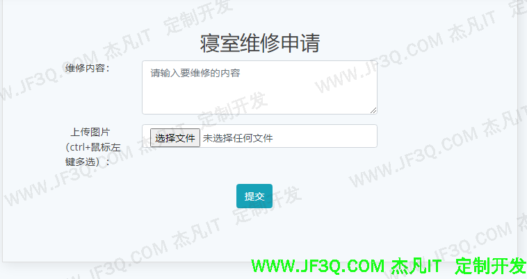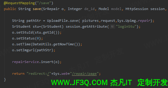 该功能主要使用使用form表单提交到/web/repair/apply,使用multiple实现多图片上传,使用accept显示上传文件的格式。根据session获取当前学生的登录信息,将该学生的id传入学生实体,并在repairService里把该数据的维修状态设置未0(使用status字段标识维修状态:0等待为序,1已维修),调用repairService.save()保存至数据库, 代码如下: