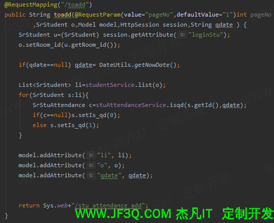 请求/web/stuAttendance/toadd,会根据寝室长输入的日期查询改日内该寝室的所有成员是否提交考勤,若寝室长未输入日期,则默认查询今日考勤的情况,根据is_dq字段来判断寝室成员是否已经签到,若is_dq=0标识未签到,is_dq=1表示已签到。代码如下: