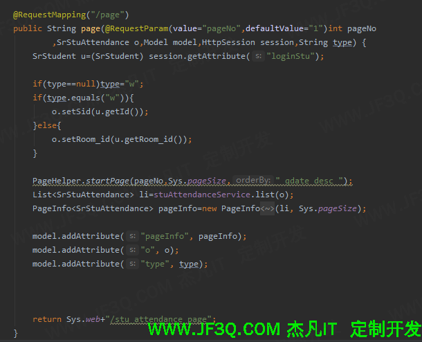 请求路径/web/stuAttendance/page?type=类型,type=qs表示寝室长管理本寝室成员的考勤记录,type=w表示普通成员查看自己的考勤记录。采用pagehelper分页。代码如下: