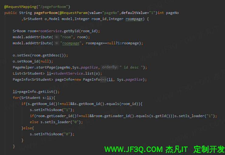 宿舍楼栋添加时,根据is_normal判断该楼栋是否是隔离楼栋,is_normal=1表示正常楼栋,is_normal=0则表示隔离楼栋,若有需要隔离的学生,则直接进入隔离楼栋,选择需要分配的宿舍。请求路径/jsp/student/pageForRoom?room_id=宿舍id,先调用roomService.getById()获取该公寓的具体信息,根据该公寓的类型(分为男寝和女寝),查询出与之对应的男学生或者女学生。根据学生的room_id与前端传过来的room_id对比判断该学生是否属于本寝室的成员,根据学生room_id是否等于0或者null来判断该学生是否分配寝室。代码如下: