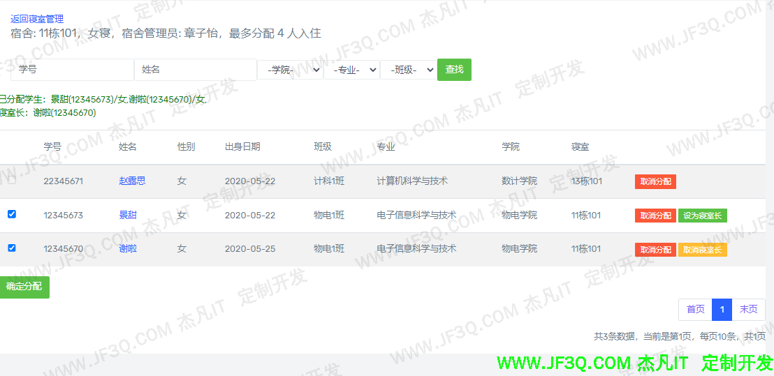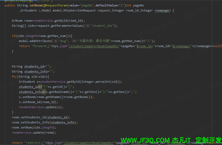 已分配的本寝室数据根据inThisRoom=1来判断并且已选中,其他宿舍的学生则需要先取消所在宿舍,才可以成功分配到本寝室。使用form表单提交至/jsp/student/setRoom?room_id=本寝室id,根据表单setudent_ids的长度判断人数是否符合本寝室的入住人数。而后循环setudent_ids为这些学生数据分配宿舍,修改room_id,并将这些学生的姓名和学号都存入对应的宿舍里,方便展示。代码如下: