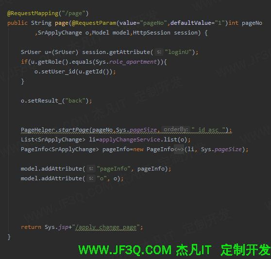 请求路径/jsp/applyChange/page,根据session获取当前登录的用户,而后根据该用户的role字段判断是管理员还是宿管,如果是宿管则根据宿管id查询他管理的寝室申请列表,管理员则查询所有列表 。调用applyChangeService.list()方法配合pagehelper分页插件,查询分页数据并放入model传入jsp页面。代码如下: