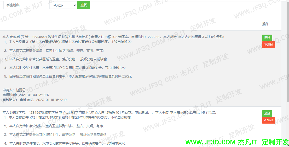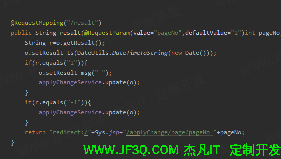 根据学生的提交信息选择审核通过或者不通过,一般是需要交换的双方同时申请(或者申请空的寝室),同意后可相互交换寝室。调用applyChangeService.update()修改result的值,以此实现换侵功能。 代码如下: