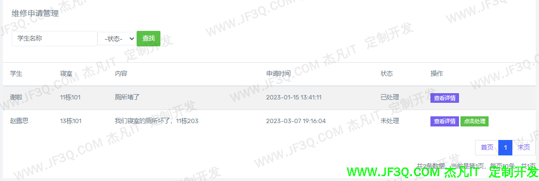 请求路径/web/repair/page,传入参数pageNo(默认第一页),根据session获取当前学生的登录信息,将该学生的id传入repairService.list()查询该学生的换寝申请数据,使用pagehelper进行分页。并将查询结果封装到pageInfo实体,使用model传给jsp页面,当数据是待维修状态时可以进行删除。代码如下: