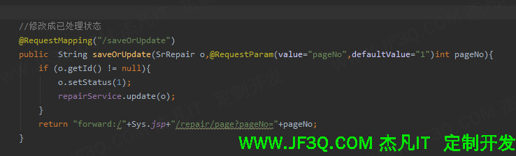 点击处理按钮,请求/jsp/repair/saveOrUpdate,修改result=1,并调用repairService.update()保存至数据库。代码如下: