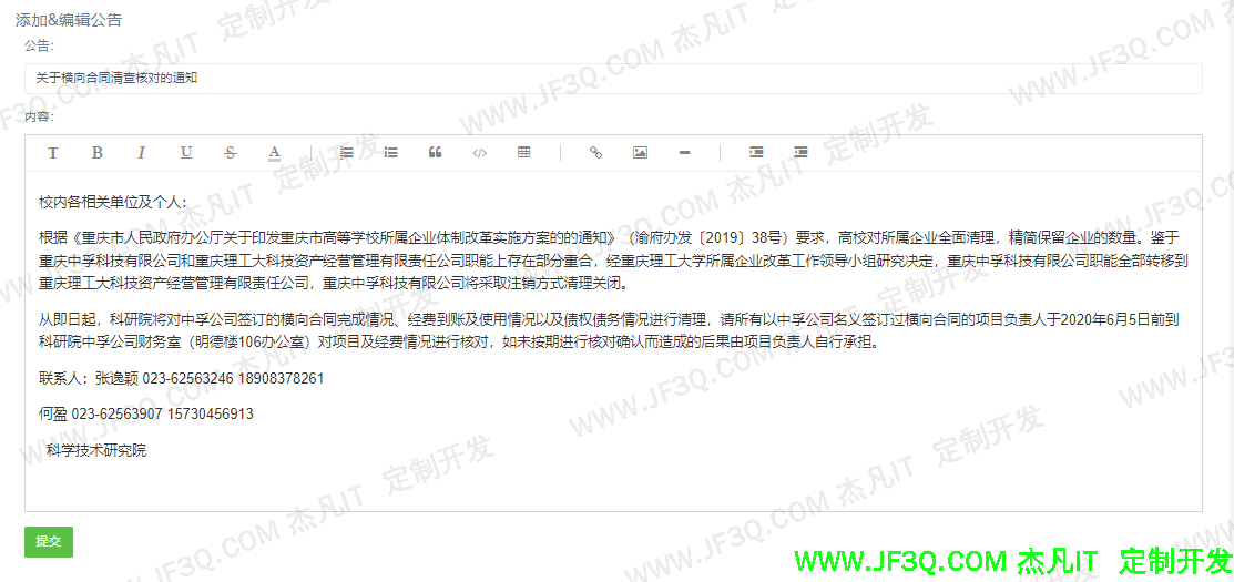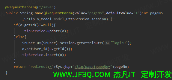 前端使用simditor.js富文本编辑框实现公告主题的多样式的灵活排班。使用forum提交公告主体到/jsp/tip/save控制器。根据id是否为空,调用tipService.save()保存或者update()更新公告。代码如下: