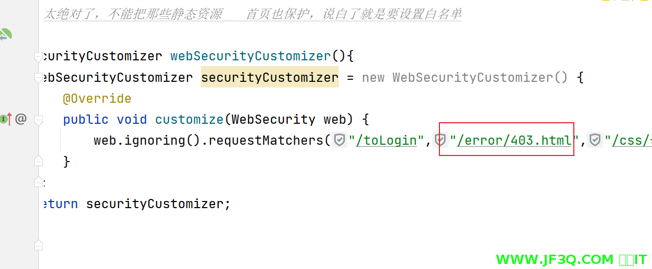 1.在 WebSecurityConfig 类中添加以下方法,允许静态资源直接放行。//白名单 黑名单