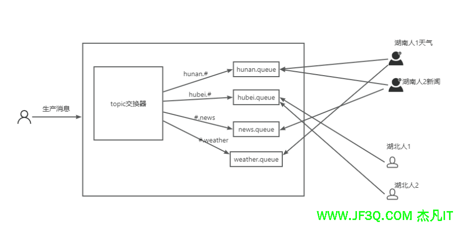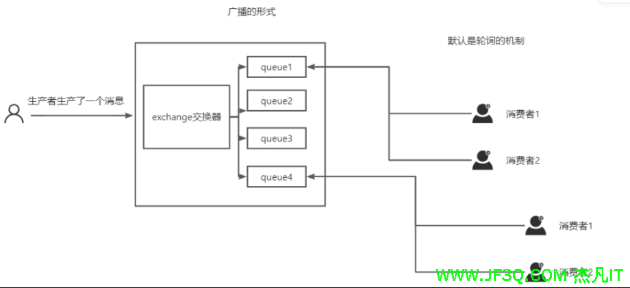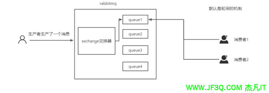 一个消息可投入一个或多个队列。消息一直在队列里面,等待消费者连接到这个队列将其取走。