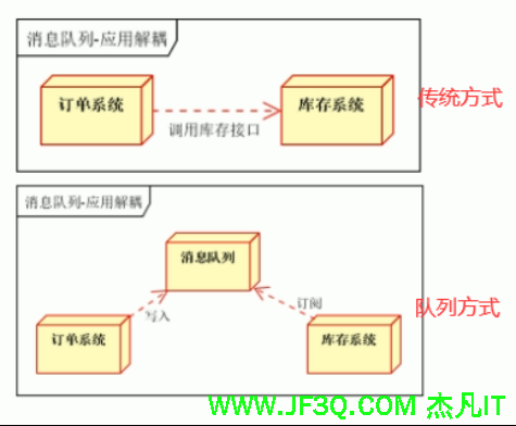 当用户下单后要对库存系统进行一系列增删改查操作。传统方式的话耦合性太高。