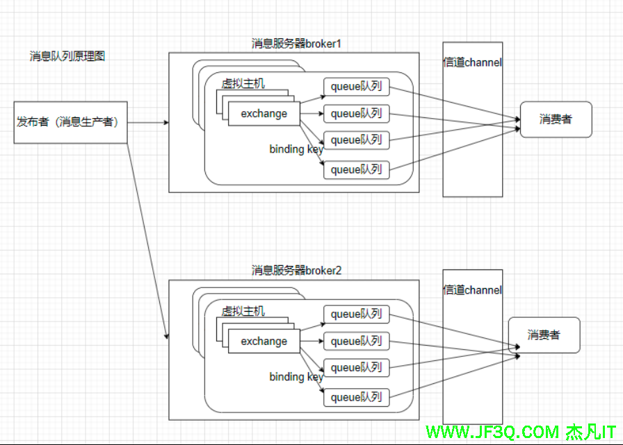 多路复用连接中的一条独立的双向数据流通道,信道是建立在真实的TCP连接内的虚拟连接。AMQP命令都是通过信道发出去的,不管是发布消息、订阅队列还是接收消息,这都是通过信道完成,因为对于操作系统来说建立和销毁TCP都是非常昂贵的开销,所了信道的概念,以复用一条TCP连接。