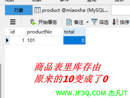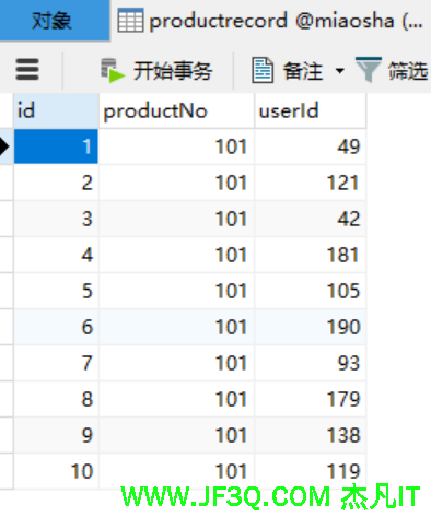 测试发现:有的用户抢购成功,有的抢购失败。再观察数据库, 表 product中商品的数量已经清0了,即被抢购完毕。Productrecord表中记录了抢到商品的用户。