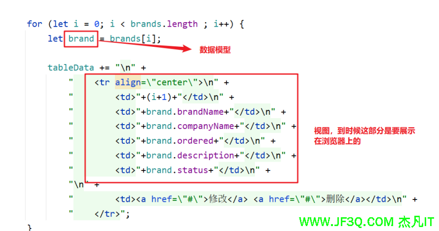 这是我们之前写的代码。是不是很繁琐,而采用了咱们vue的双向绑定思维,当数据模型数据发生变化时,页面的展示也随之发生变化。