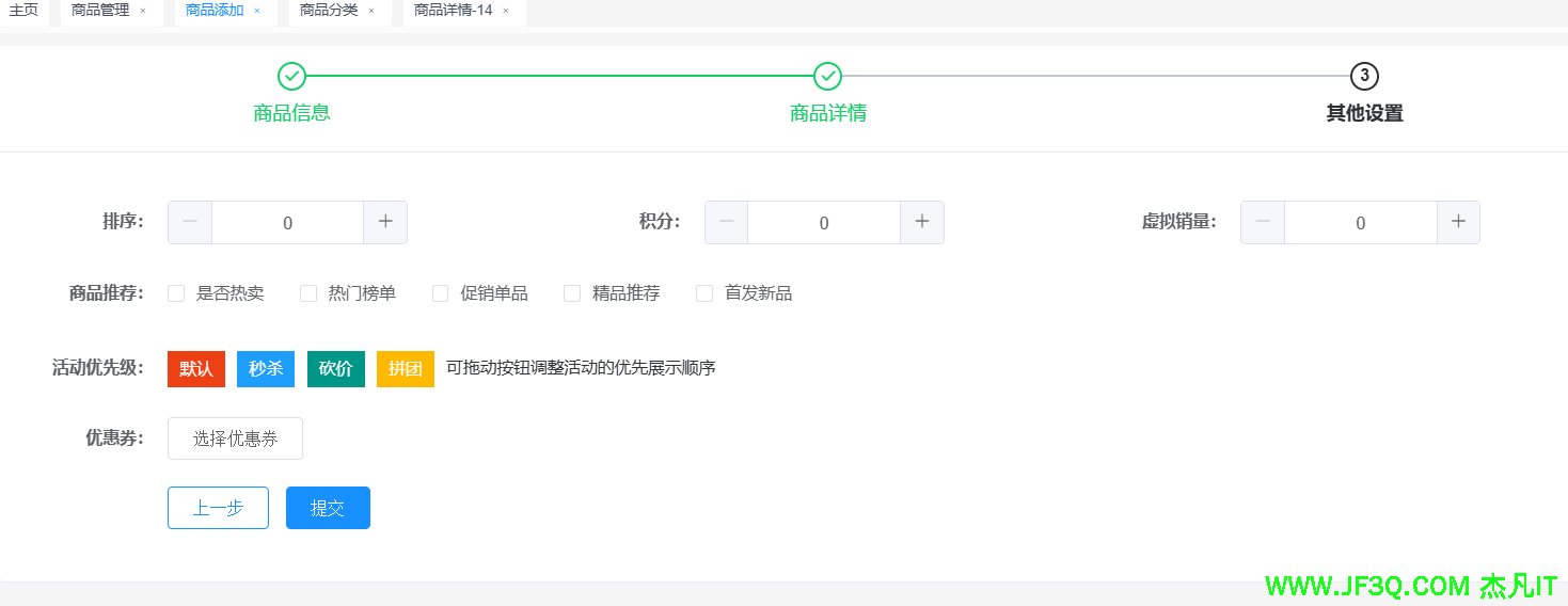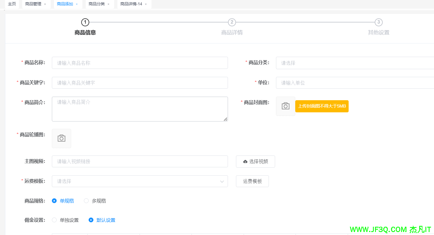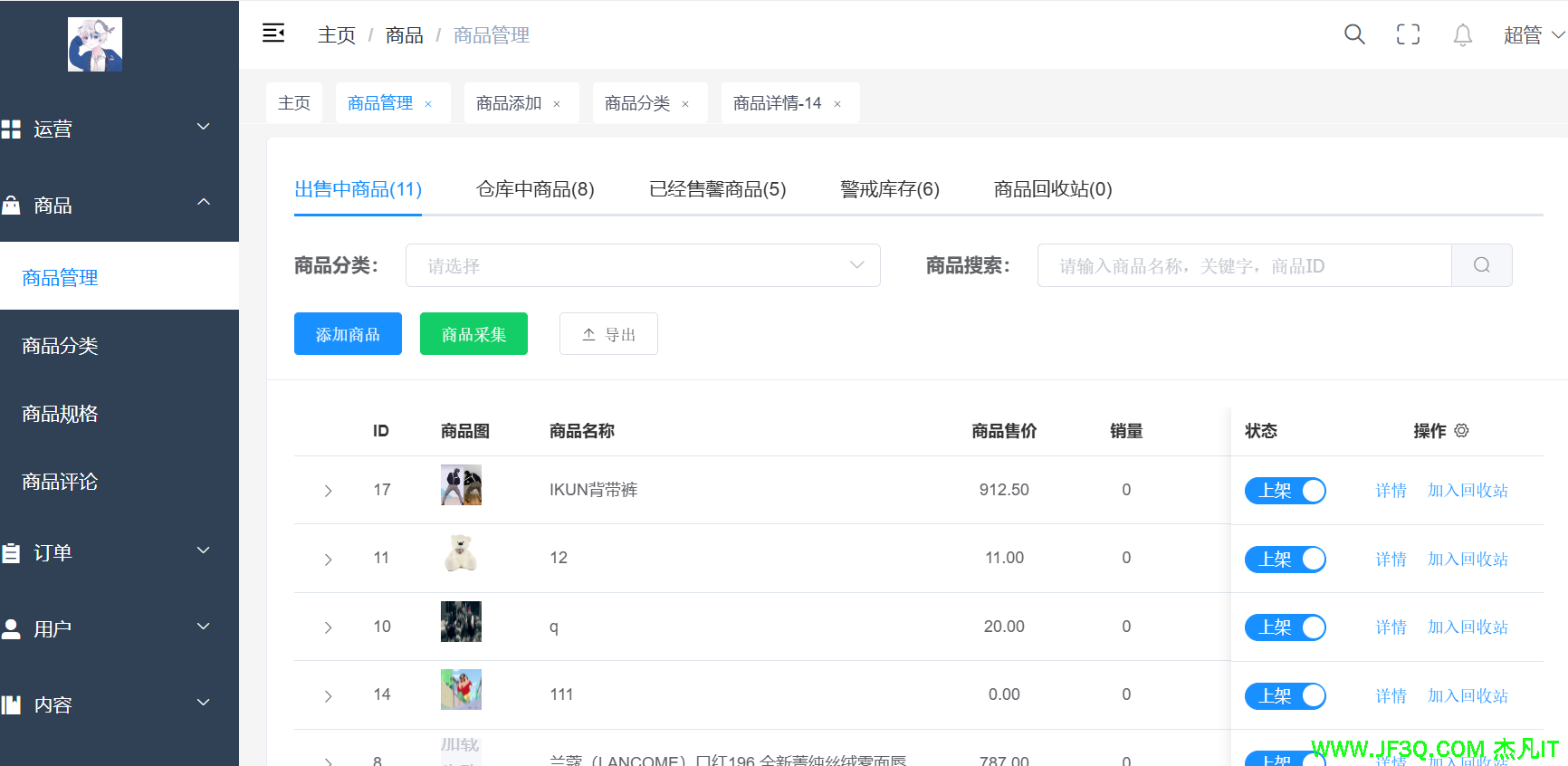 完成商品管理页面。增删改查,批量删除啥的都要。上下架商品。加入回收站,上传商品封面