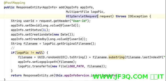 特别提醒:MutipartFile 的名称一定不能跟 AppInfo 里面的属性一样,因为如果有两个 logoPic 的话,它 不知道应该听谁的。