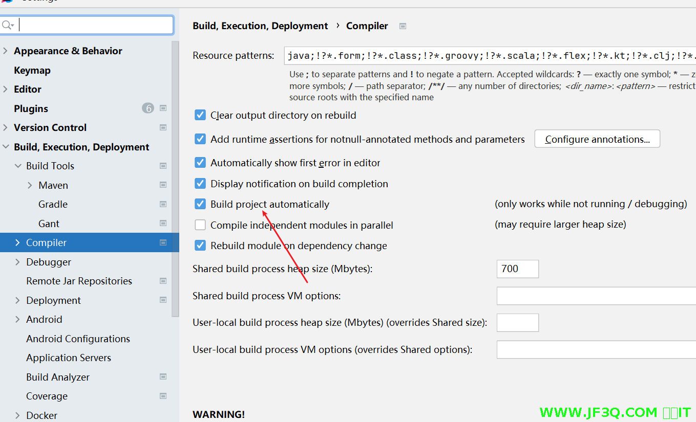 1.首先要在 IDEA 中进行自动构建项目的配置,选择菜单【File】->【Setting】->【Build,Execution,Deployment】-> 【Complier】,然后 在右侧部 分勾选 Build project automatically 选项