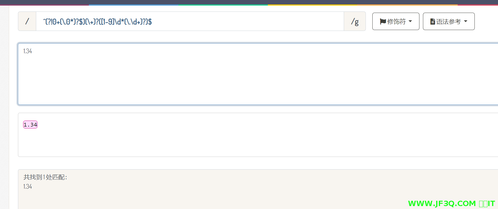 ^(?!0+(\.0*)?$)(\+)?([1-9]\d*(\.\d+)?)$然后我们可以用在线正则表达式的工具去测试写的正则是否正确