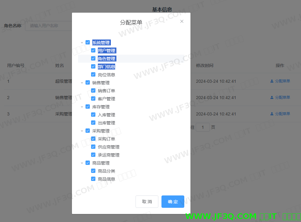可以灵活分配添加不同的角色,比如管理员、销售专员、采购专员等,给不同的角色可以分配不同的菜单
