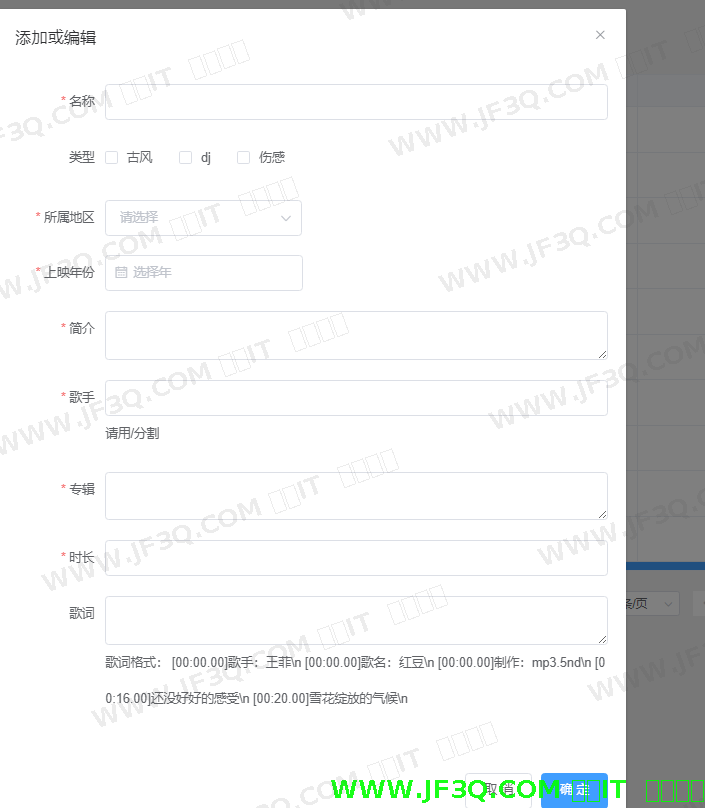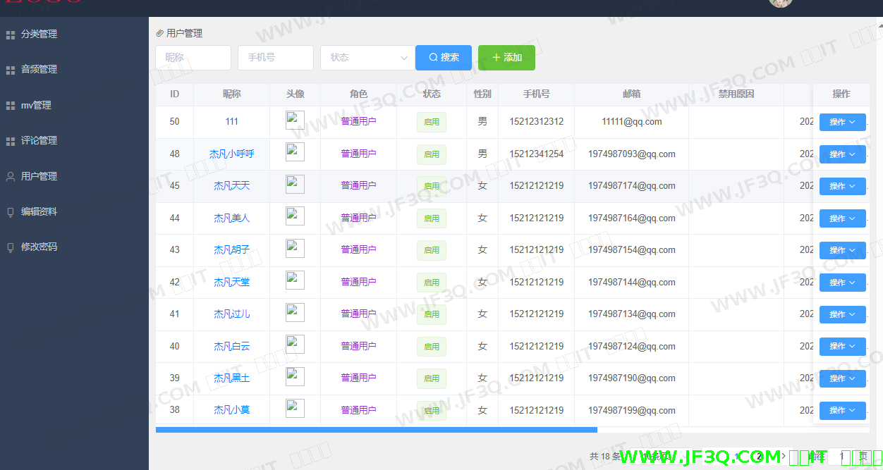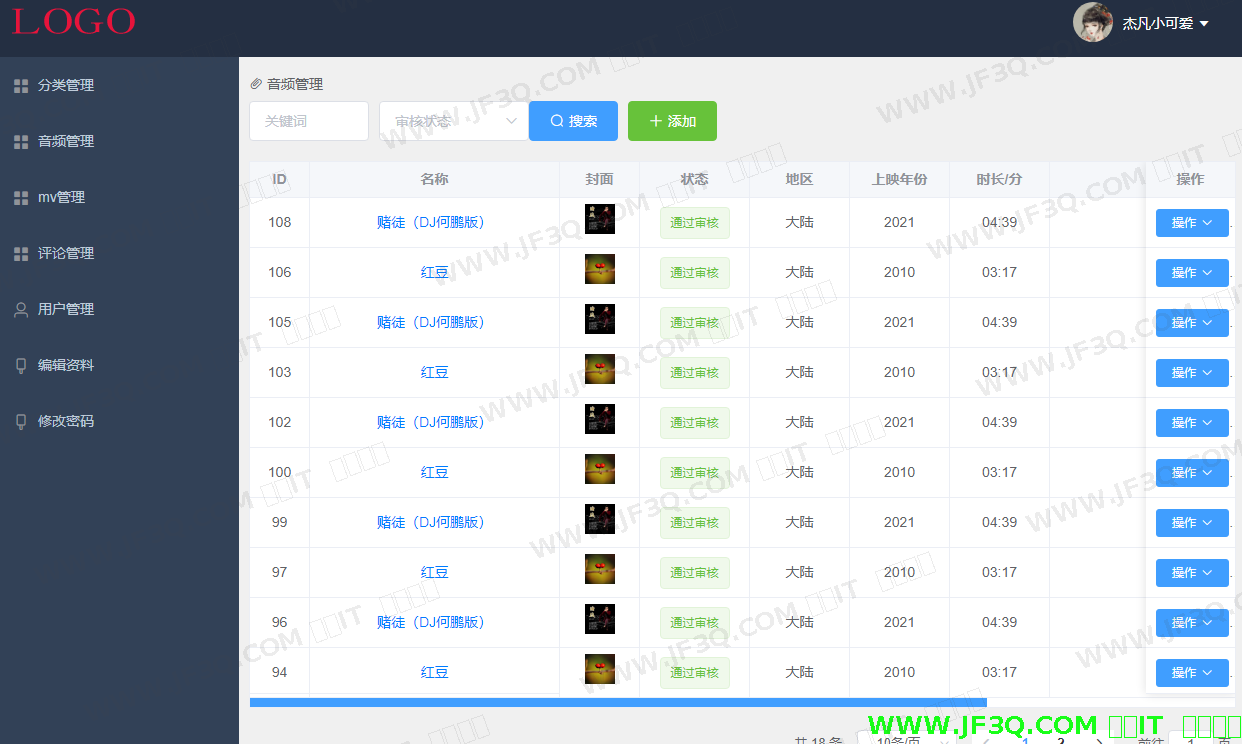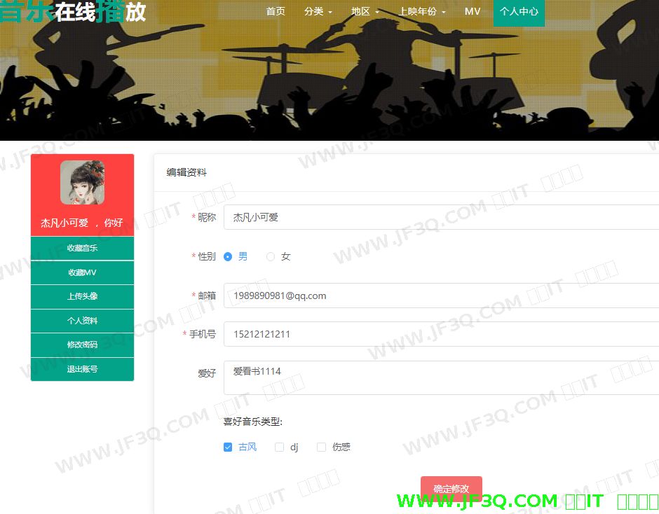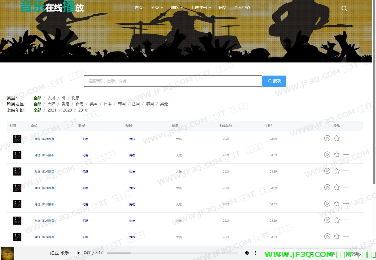 - 查询音乐:各种条件查询,根据标题,地区,分类等都可以查