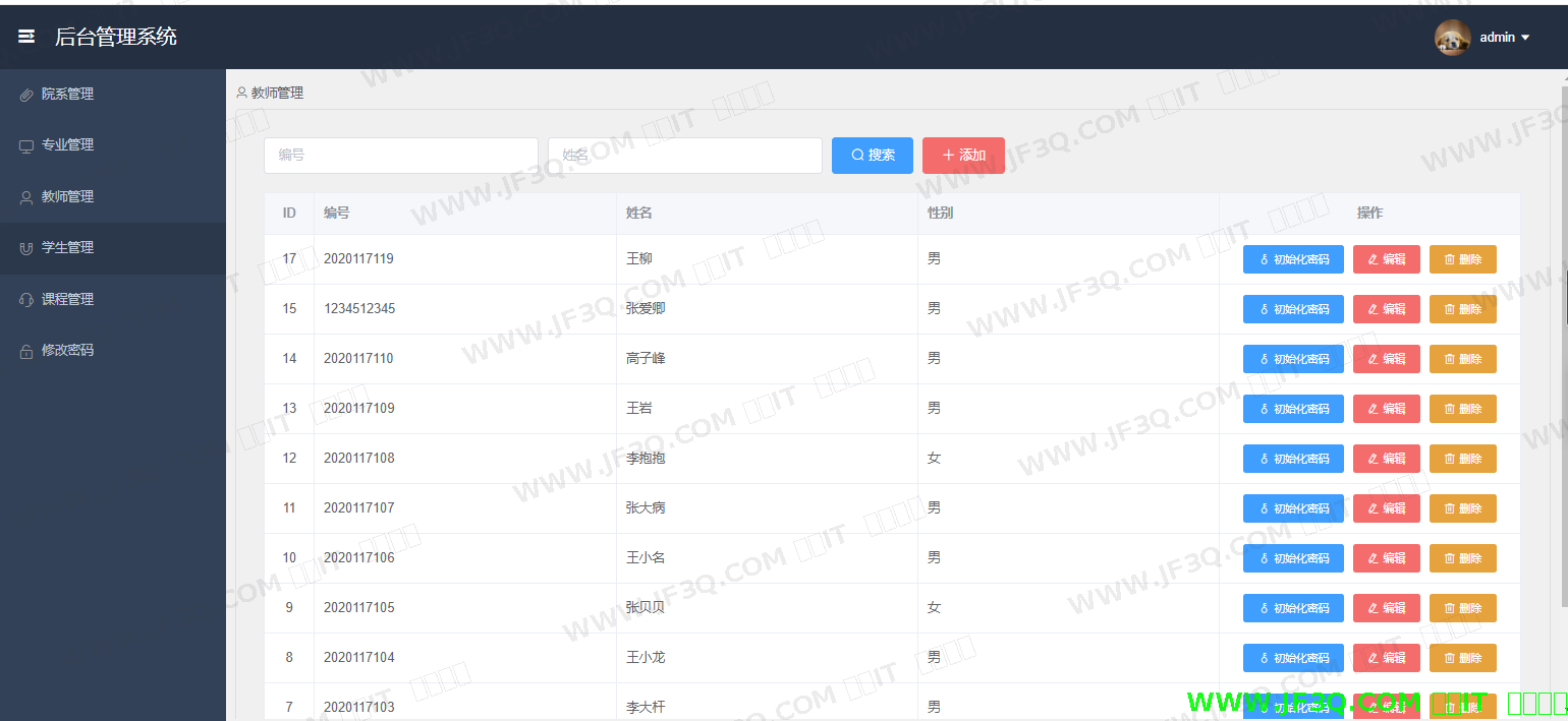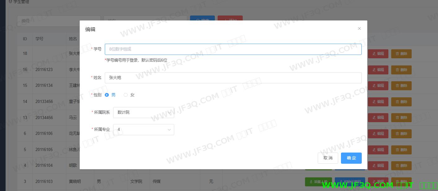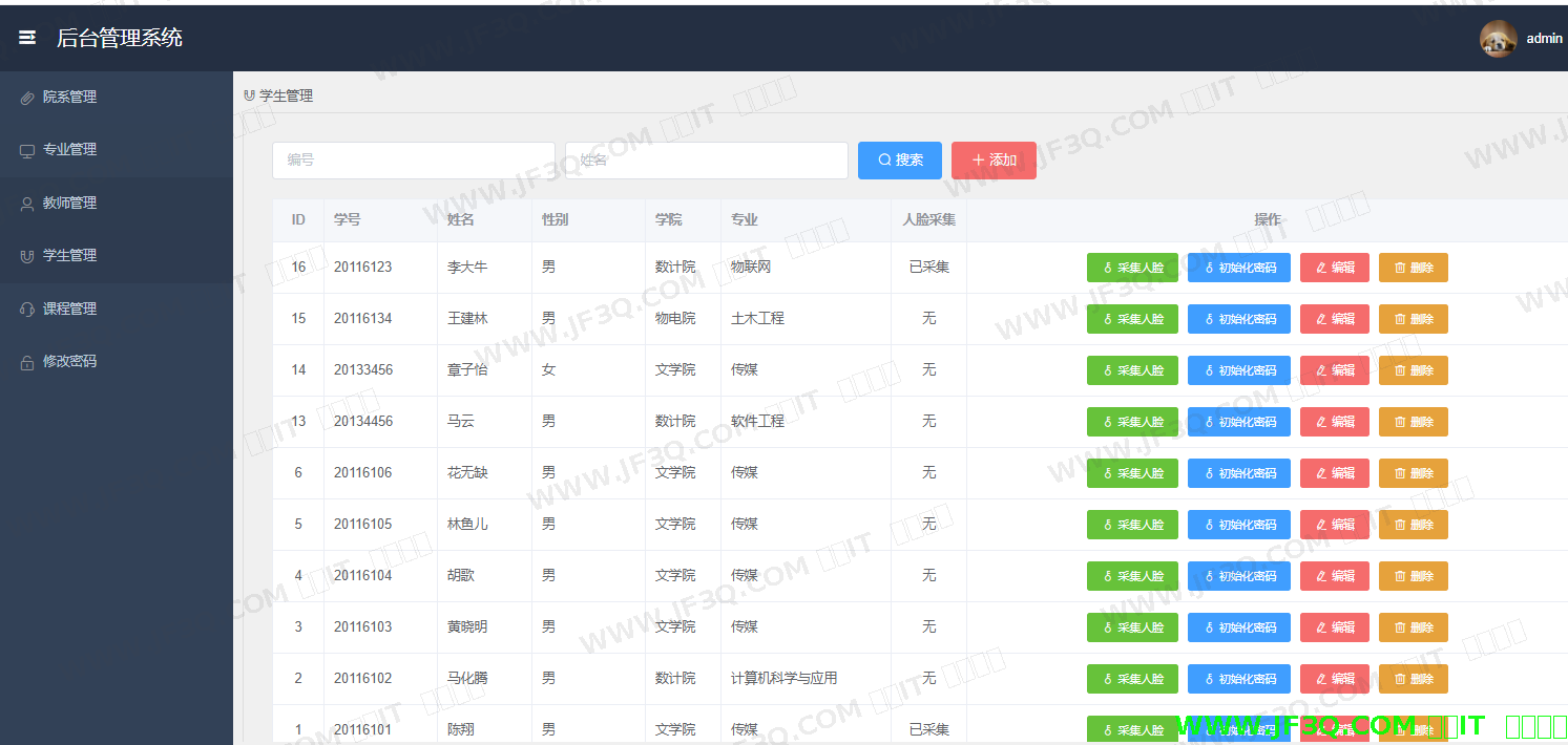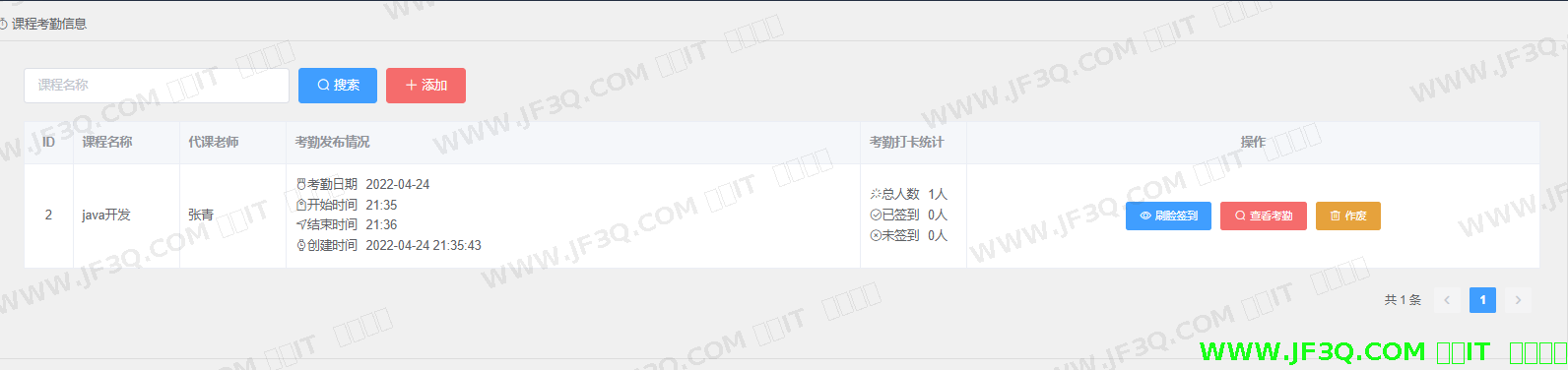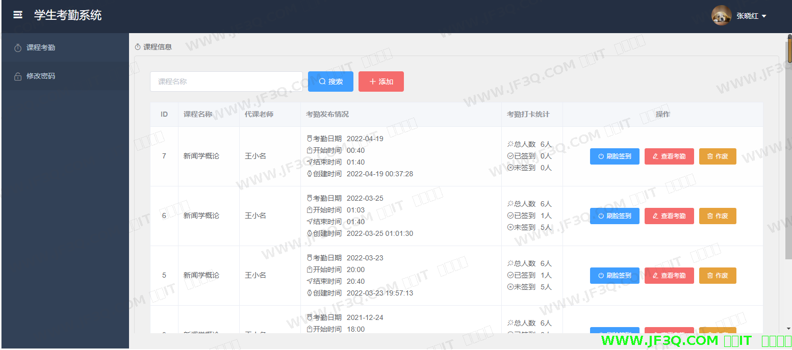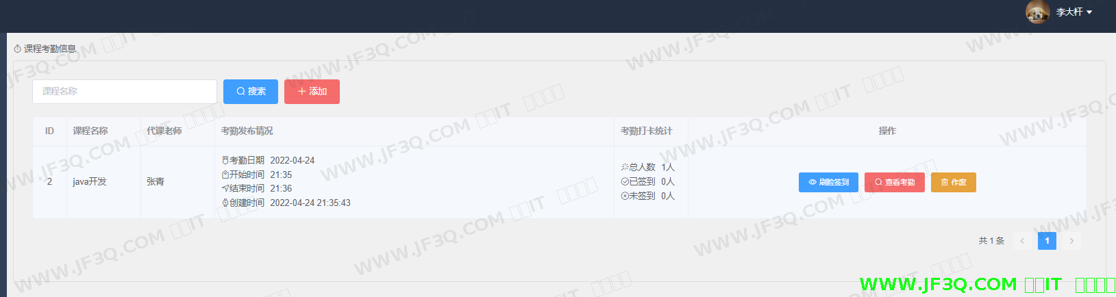 管理员发布课程指定好代课老师,并关联好学生,教师发布待签到考勤,然后学生到教师这刷脸签到即可。(人脸识别前要先在管理员端采集人脸信息存入数据库)