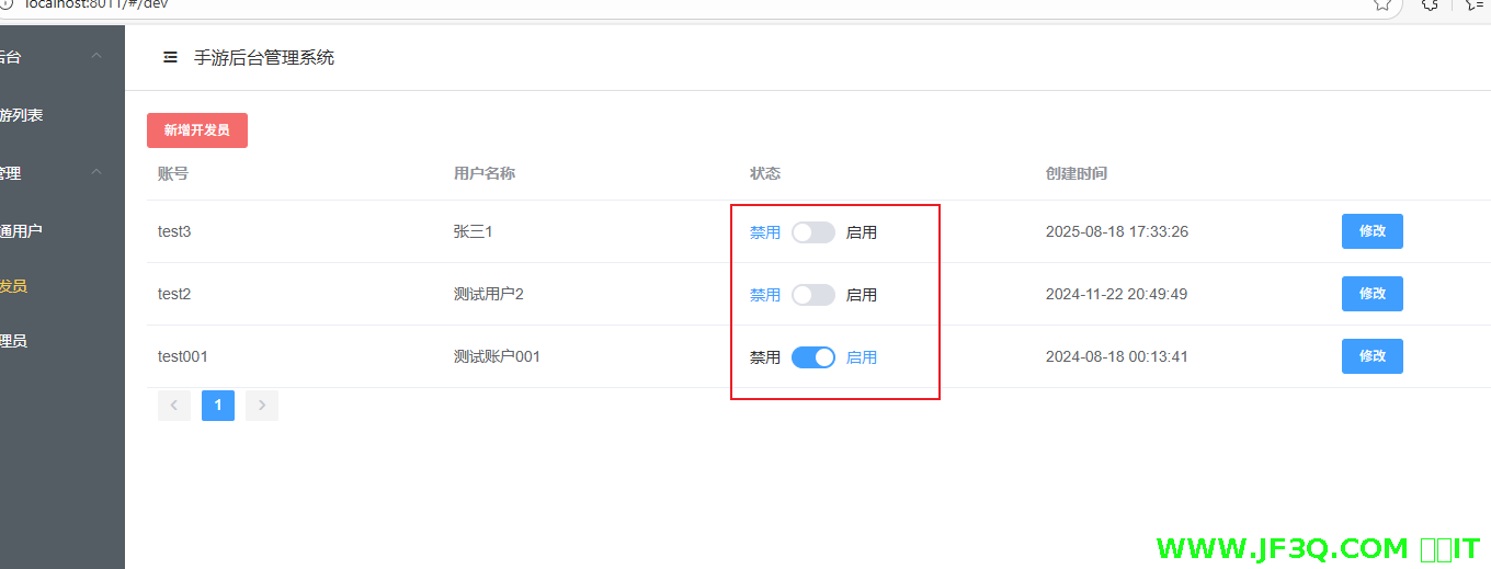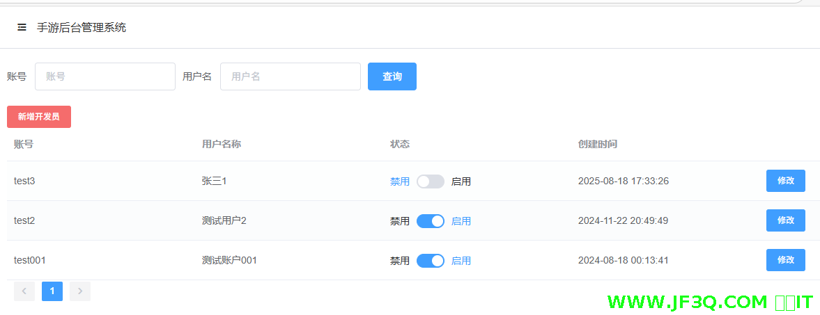 - 管理员可以添加开发者账号,对其进行增改查+禁用启用