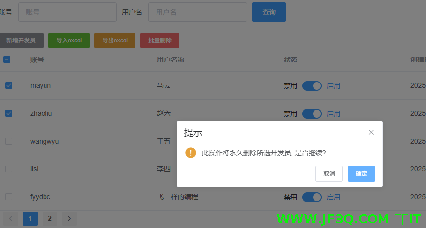 this.$confirm('此操作将永久删除所选开发员, 是否继续?', '提示', {