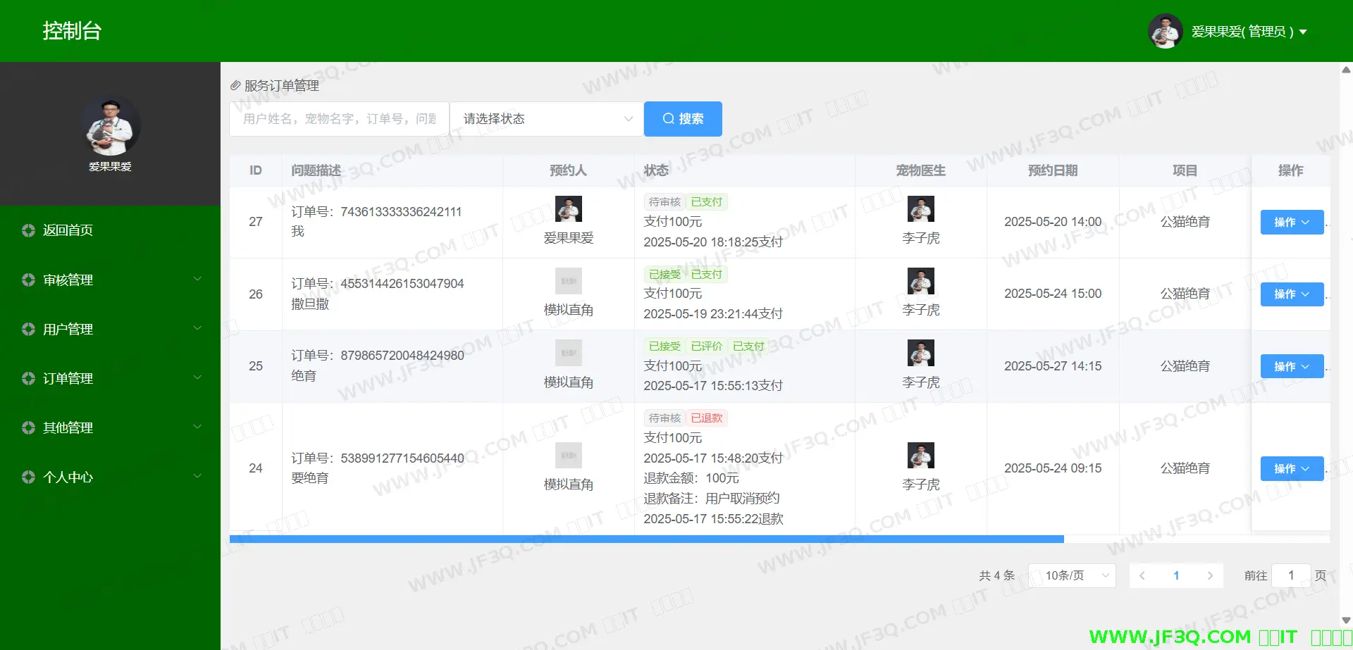 第二,完成用户管理、宠物信息管理、预约挂号、医生管理、药品管理、就诊管理、评价反馈、统计分析等模块功能实现,满足宠物医院日常营运管理的需求。