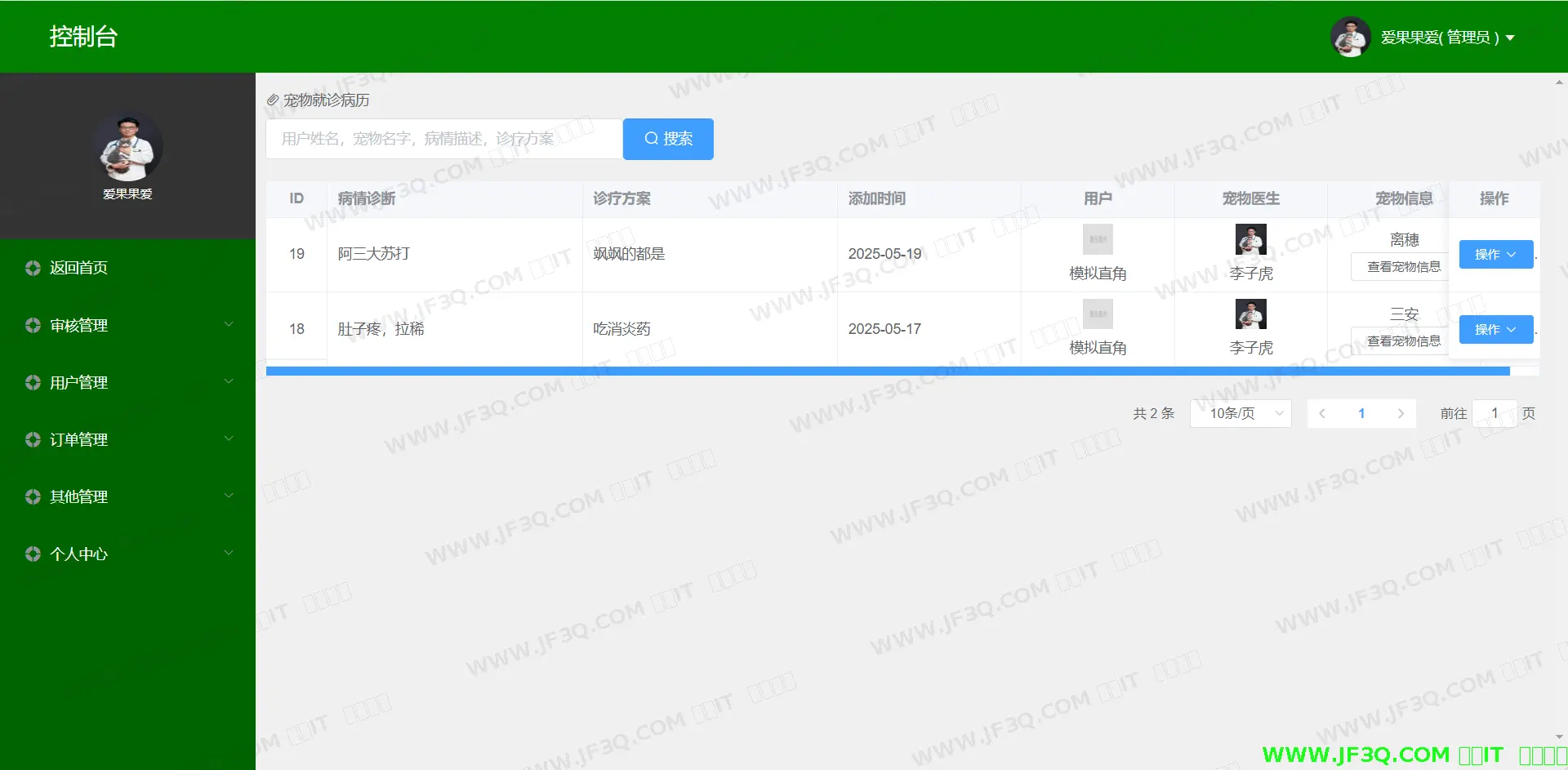 管理员登入系统后进入宠物就诊病例页面,查看所有的宠物就诊病例记录,并允许对其中的内容进行删除。宠物就诊病例功能操作表如表20所示。其功能结果如图44、45所示。