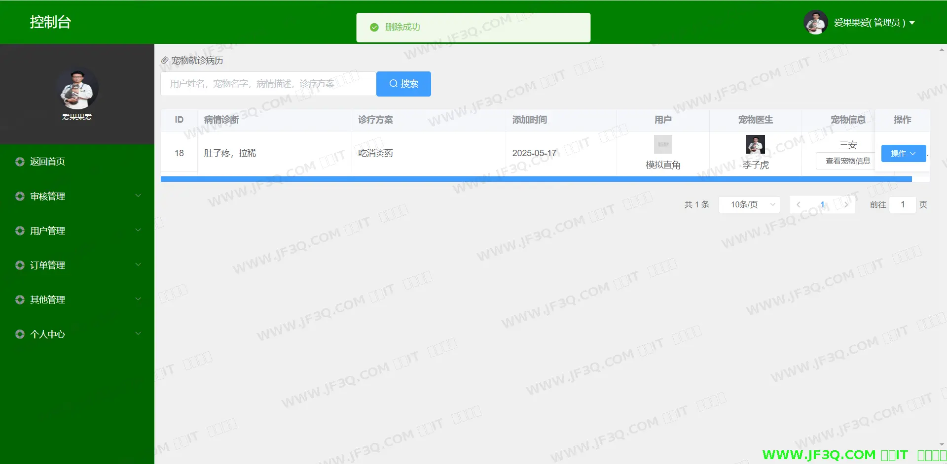 管理员登入系统后进入宠物就诊病例页面,查看所有的宠物就诊病例记录,并允许对其中的内容进行删除。宠物就诊病例功能操作表如表19所示。其功能结果如图42、43所示。