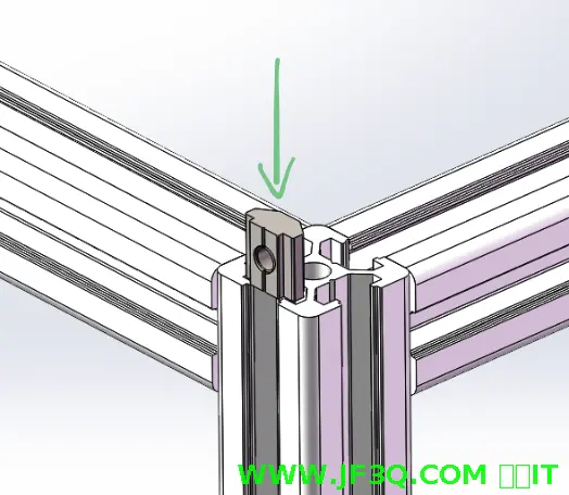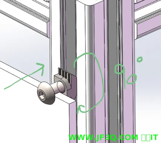 为什么这个方案叫预装呢?因为这个螺母,是需要从型材端面装进去的。而在一系列组装过程中,这个端面是很容易被其他东西堵上的,你比如旁边这两根型材,它们的端面已经被这根型材堵住了。一个型材有两个端面,如果两个端面都被堵住,那这种螺母就装不进去了。除非你再重新拆开,这个反复拆装肯定更麻烦的。所以要用这种螺母,就要在型材的两个端面没被堵上之前,提前装好,所以叫预装。