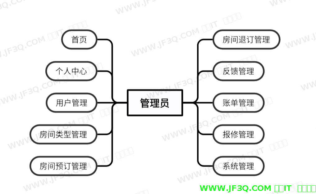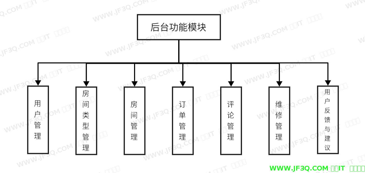 后台功能主要有房间类型管理、房间管理、用户管理、订单管理、评论管理、维修管理、用户反馈与建议等功能。管理员并且可以对其进行创建、编辑、删除和查询等操作。后台功能模块图如下图4-2所示:
