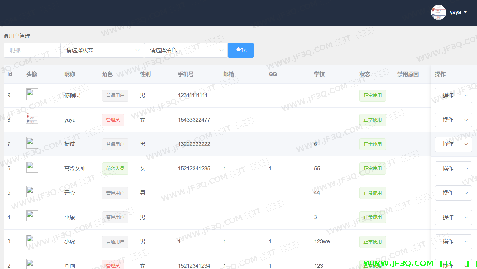 用户管理功能主页如下图5-15 所示:前台人员可以对该模块内容进行查看,并可以对维修单状态进行更改,并删除维修单等操作。