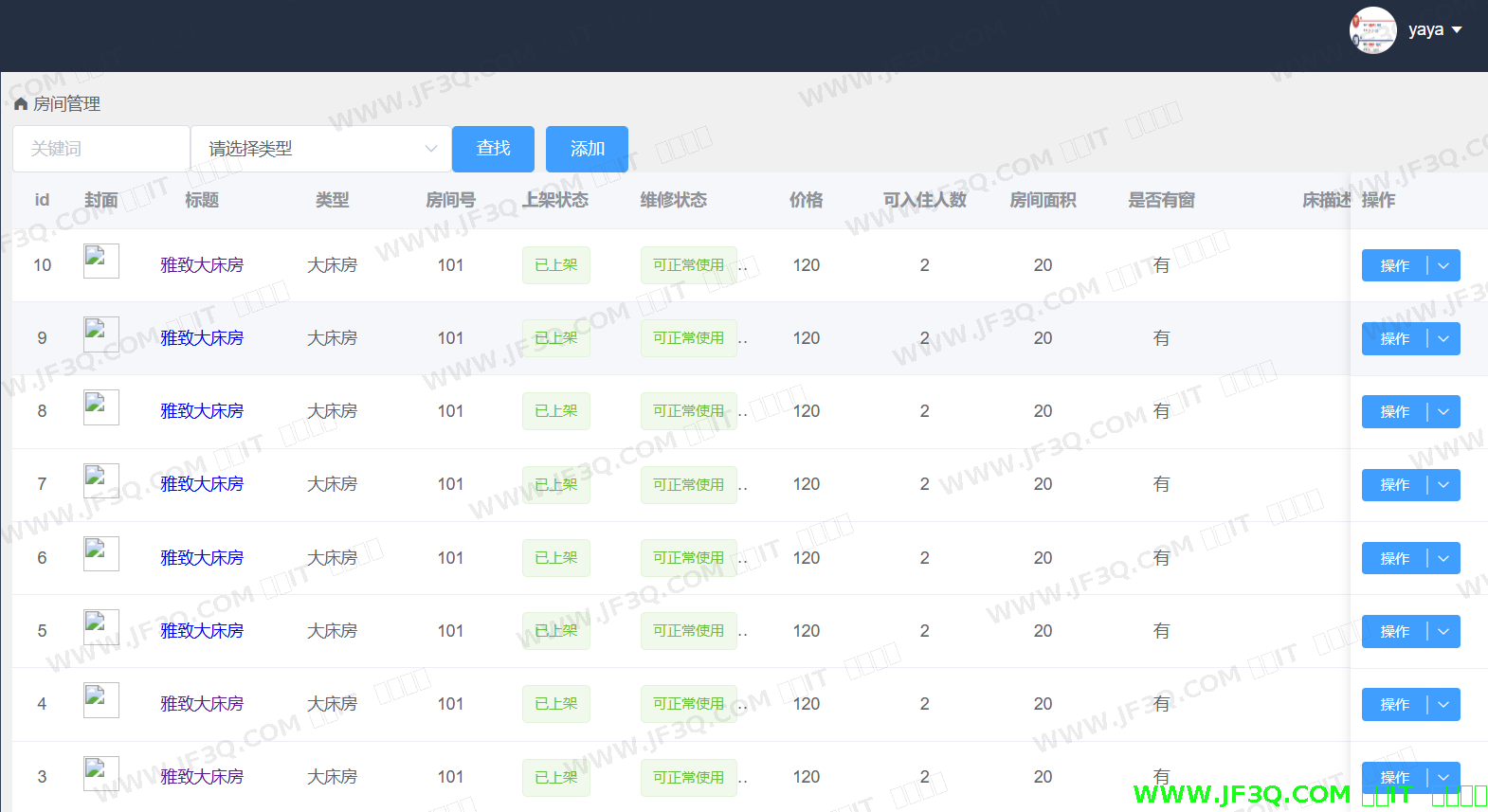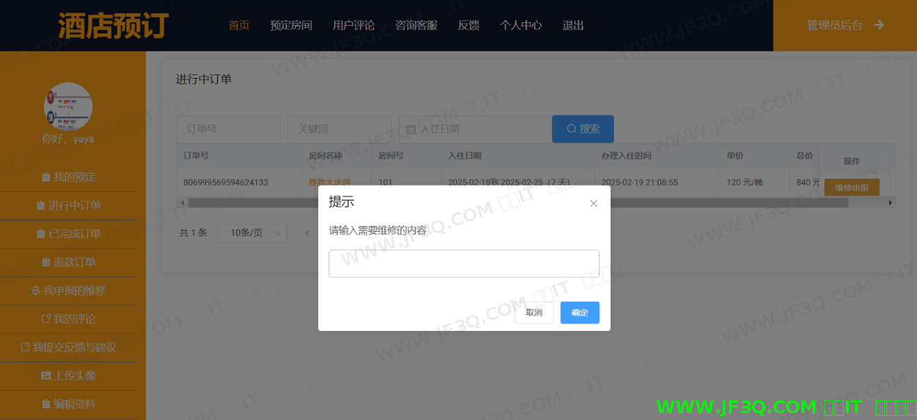 管理员成功登录后可对房间类型管理、房间管理、用户管理、订单管理、评论管理、维修管理、用户反馈与建议等进行操作。