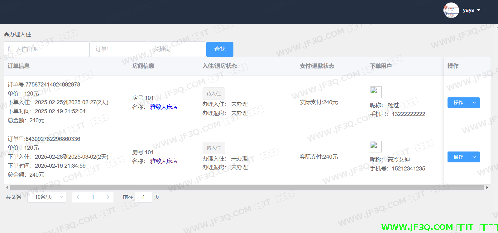 订单管理功能模块主页如下图5-13所示:前台人员可以对订单进行相应的查询,并对该模块的订单内容进行办理入住、退房等相应操作。