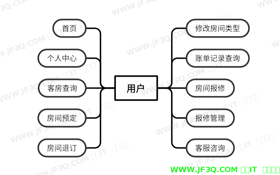 用户通过注册并登录系统后,可在首页查看通知与常用功能入口,通过个人中心修改密码或联系方式等个人信息,实时查询客房信息,并在线完成客房预订与支付。若客房设施损坏,用户可提交报修请求并跟踪维修进度;需取消预订时,系统自动计算违约金并处理退款。用户还可通过客服咨询功能联系工作人员获取帮助,或在账单记录中查询历史订单详情。用户的功能需求用例图如下图3-2所示: