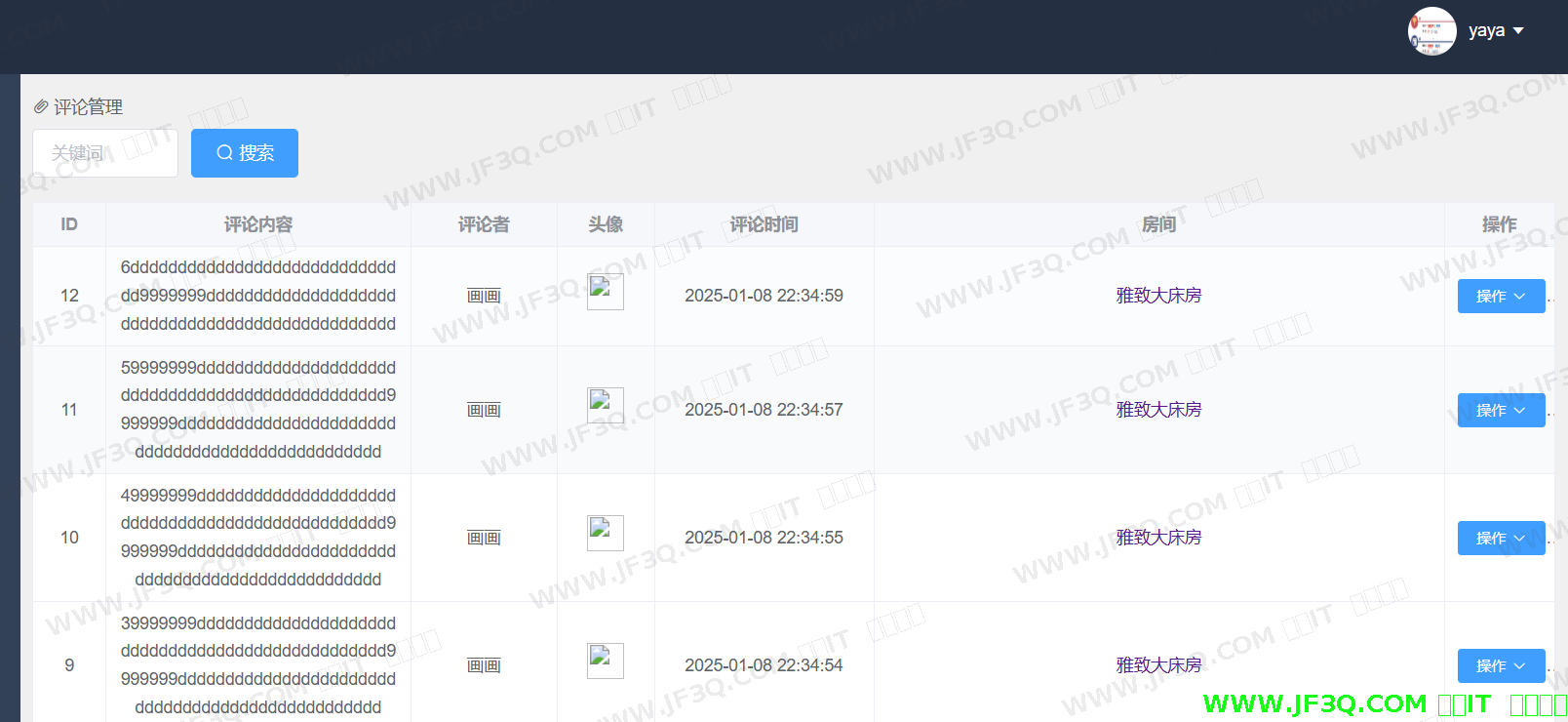 评论管理功能模块主页如下图5-14 所示:前台人员可以对该模块内容进行查看、删除等相应操作。