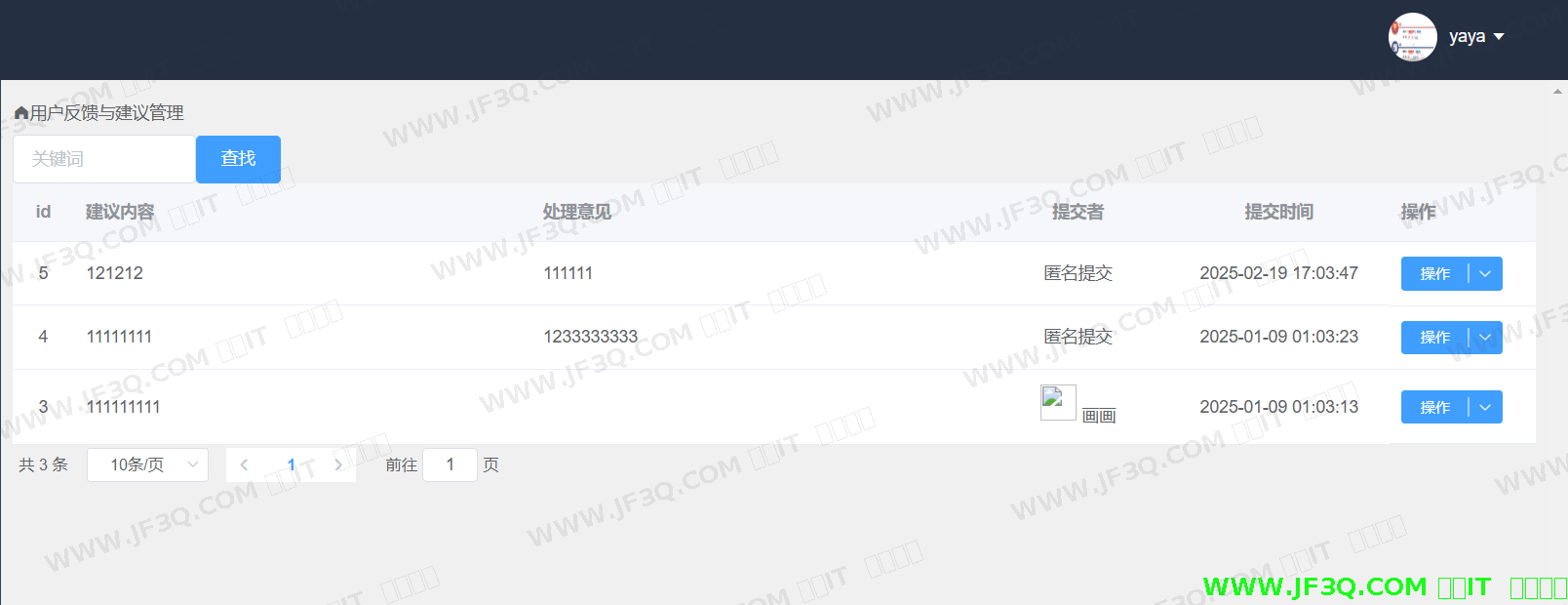 用户反馈与建议功能主页如下图5-16所示:前台人员可以对用户相应的反馈输入处理意见、删除等操作。