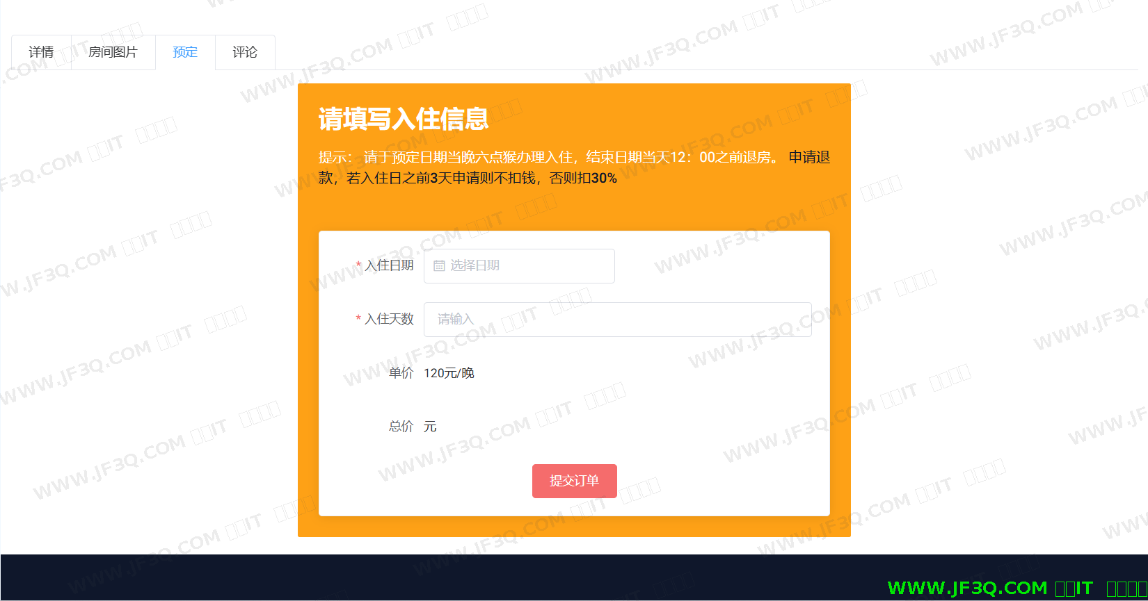 (1)登录后,选定一家客房,点击立即预定,客房预定页面如下图6-5所示: