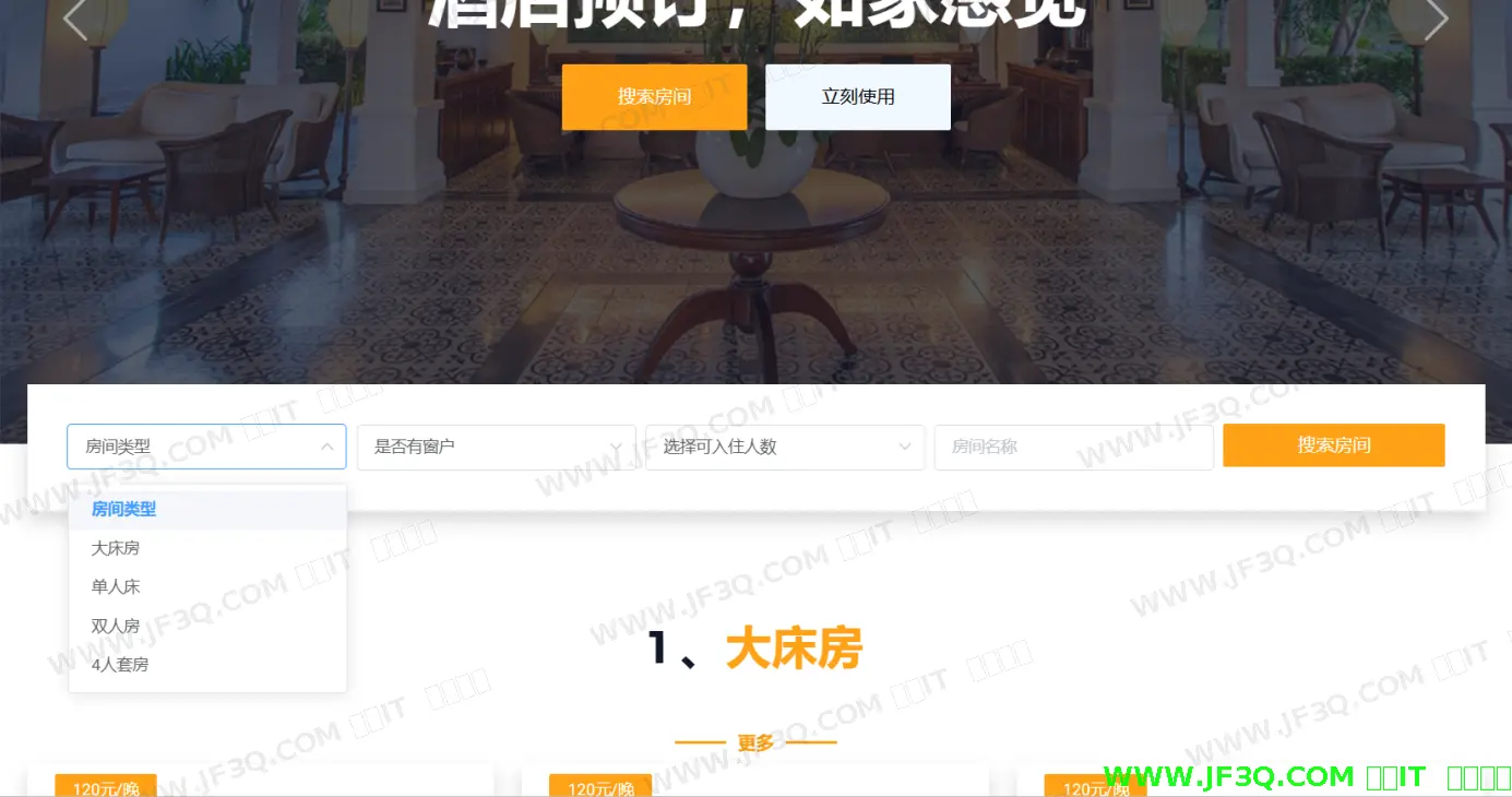 用户查询酒店功能主页如下图5-18所示:用户可选择根据房间类型、是否有窗户、入住人数等来筛选想要的酒店房间。