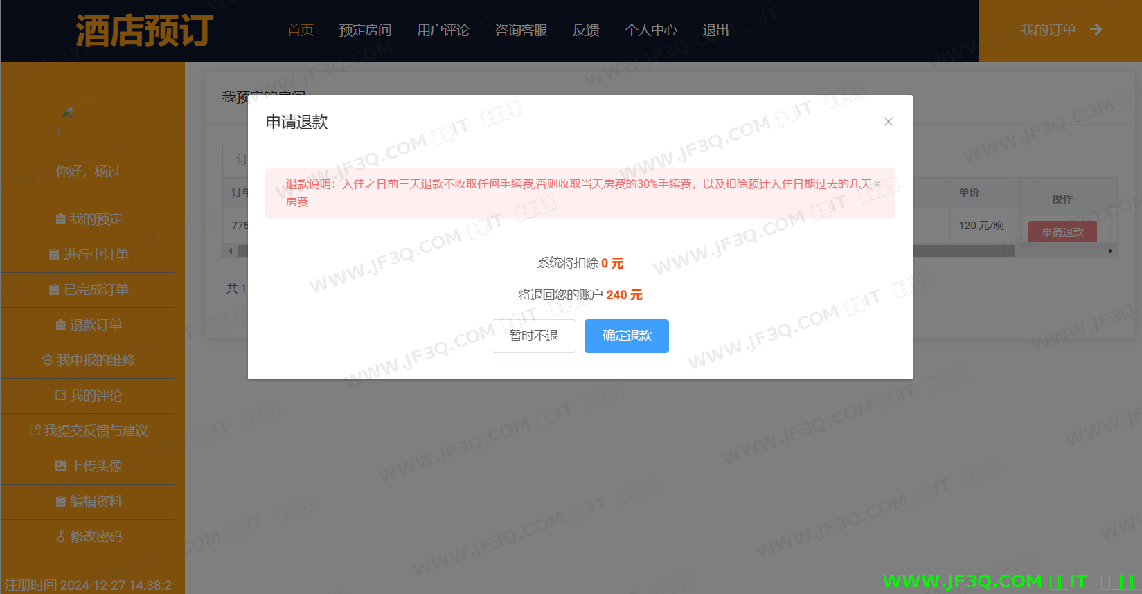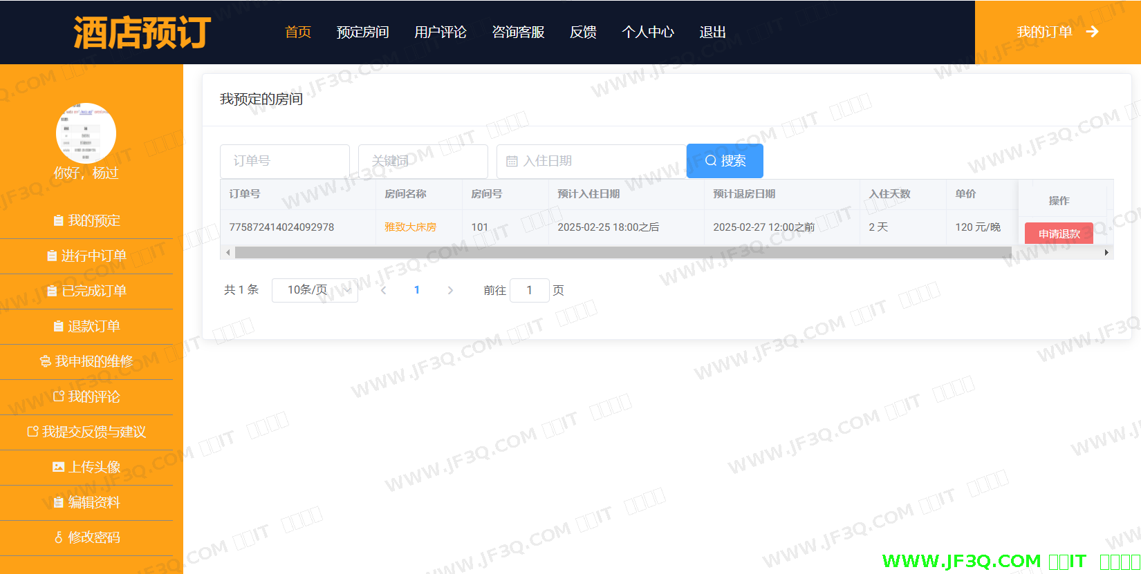 客房退订功能主页如下图5-19所示:用户在个人中心-我的预定中找到订单,点击“申请退款”即可退订客房。