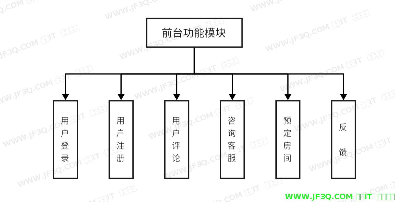 前台功能主要有注册、登录、预定房间、用户评论、咨询客服、反馈。当用户进行登录与注册,并成功进入系统后,用户可操作的功能主要有修改密码、更换头像等个人信息,查看个人的预定酒店订单,还可查看自己申报的维修记录、反馈等功能进行相应操作。并且可以对其进行删除和查询等操作。前台功能模块图如下图4-1所示: