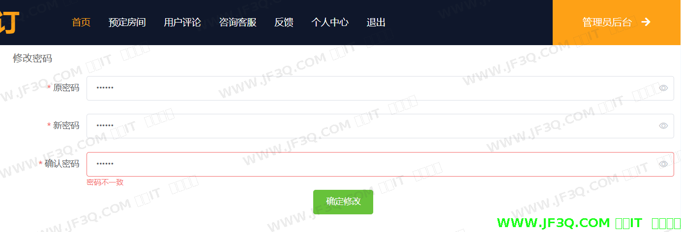 (1)登录之后,系统跳回首页,点击顶部栏的个人中心,跳转页面,点击左侧边栏的修改密码,即可开始修改密码。若输入正确无误的原密码,再次输入两次新密码,系统校验通过后,即可修改成功。若用户两次输入的密码不相同,点击确认修改的按钮后,系统屏幕上方就会提示“密码不一致”,则修改不成功。