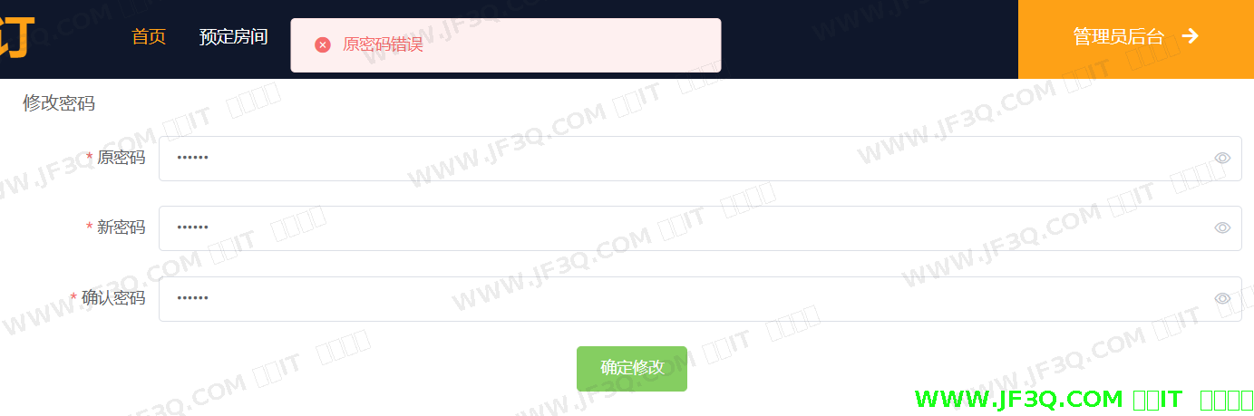 (2)登录之后,系统跳回首页,点击顶部栏的个人中心,跳转页面,点击左侧边栏的修改密码,即可开始修改密码。若输入不正确的原密码,并且输入两次相同无错误的新密码,点击确认修改的按钮后,系统屏幕上方就会提示“原密码错误”,修改不成功页面如下图6-3所示: