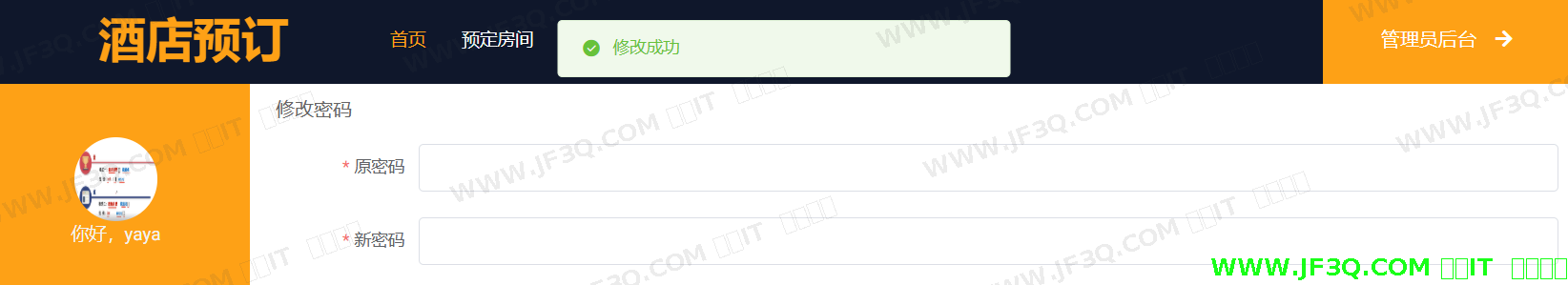 (3)登录之后,系统跳回首页,点击顶部栏的个人中心,跳转页面,点击左侧边栏的修改密码,即可开始修改密码。若输入正确无误的原密码,且输入两次一致的新密码,点击确认修改的按钮后,系统屏幕上方就会提示“修改成功”,修改成功页面如下图6-4所示: