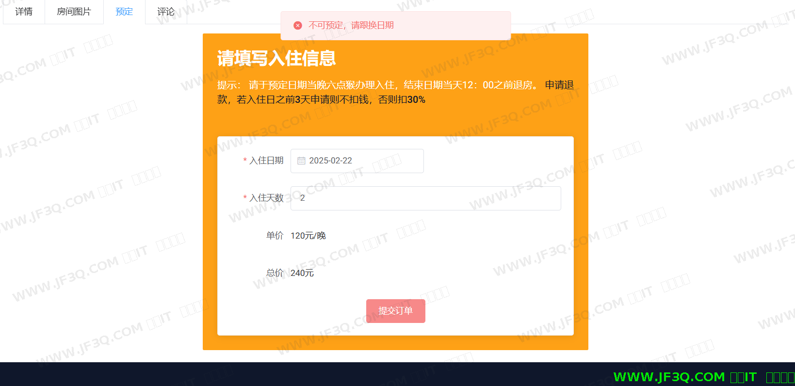 (%1) 输入相应信息后,点击保存,若入住时间早于当前时间,点击提交订单,系统上方就会提示“不能预定,请更换日期”,创建不成功页面如下图6-6所示: