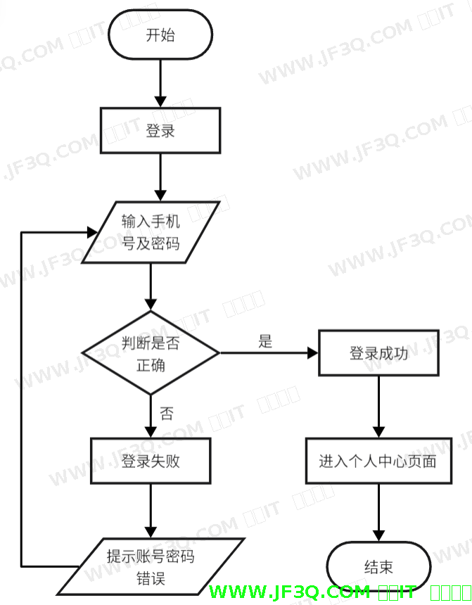 已注册的用户只需输入手机号和密码即可登录该系统,若输入过程中有误,系统则弹窗提示“账号密码错误”,用户需要重新输入。若输入的信息正确,则登录成功,直接跳转到用户个人中心页面。用户登录操作流程图如下图4-3所示: