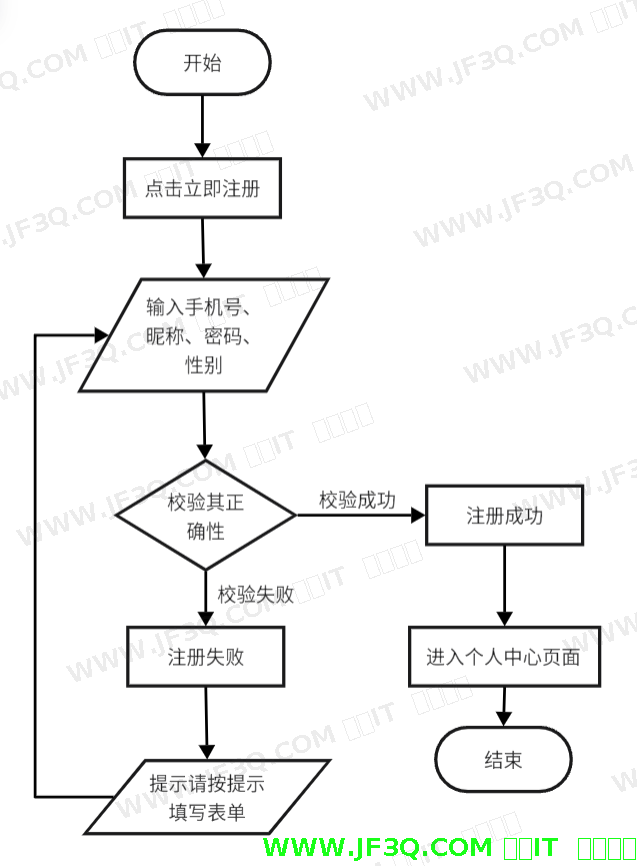 当用户未进行注册时,可点击“创建新用户,立即注册”,页面跳转进入注册页面,用户需要正确提供相应信息,提交后若符合校验,则显示注册成功并直接登录,登录成功后就会跳转至个人中心页面。注册操作流程图如下图4-4所示: